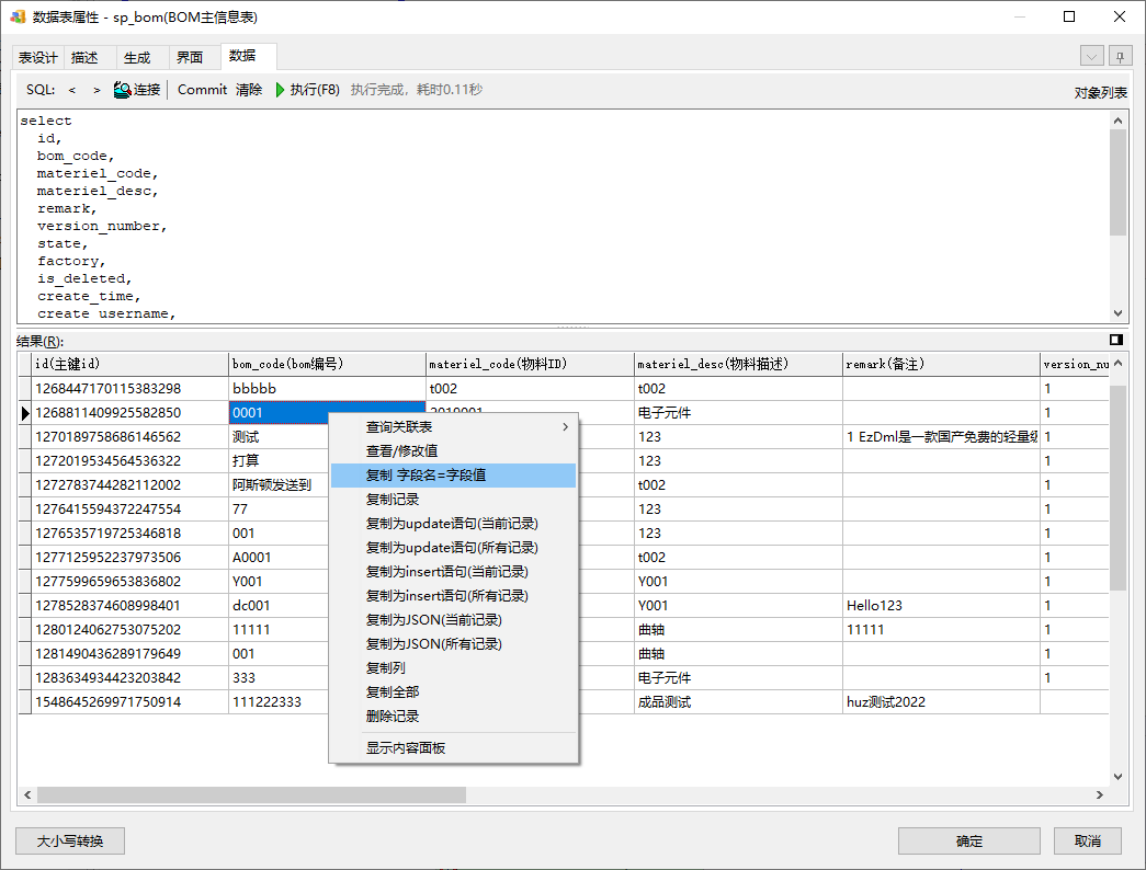由于我们已经在模型里建立表对象之间的关系,因此SQL工具中可以轻松地查询关联表的数据。比如我们在sp_bom的数据结果中选中一个单元格,右键弹出菜单,其中“查询关联表”的下面,会针对当前记录列出所有关联表的查询条件: